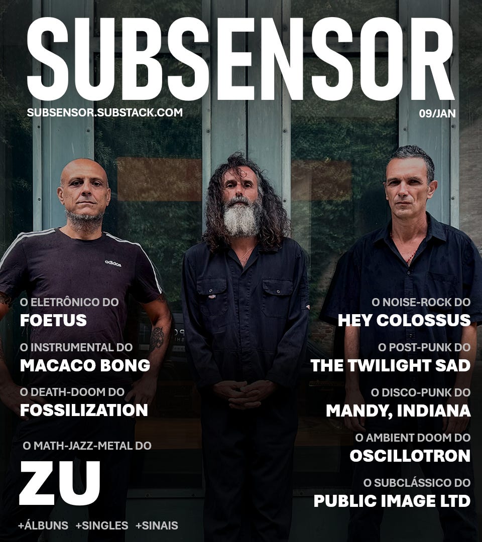 Novos álbuns do ZU, FOETUS e MACACO BONG. Novos singles do FOSSILIZATION, HEY COLOSSUS, THE TWILIGHT SAD, MANDY, INDIANA e OSCILLOTRON. O subclássico do PIL. +Álbuns. +Singles. +Sinais