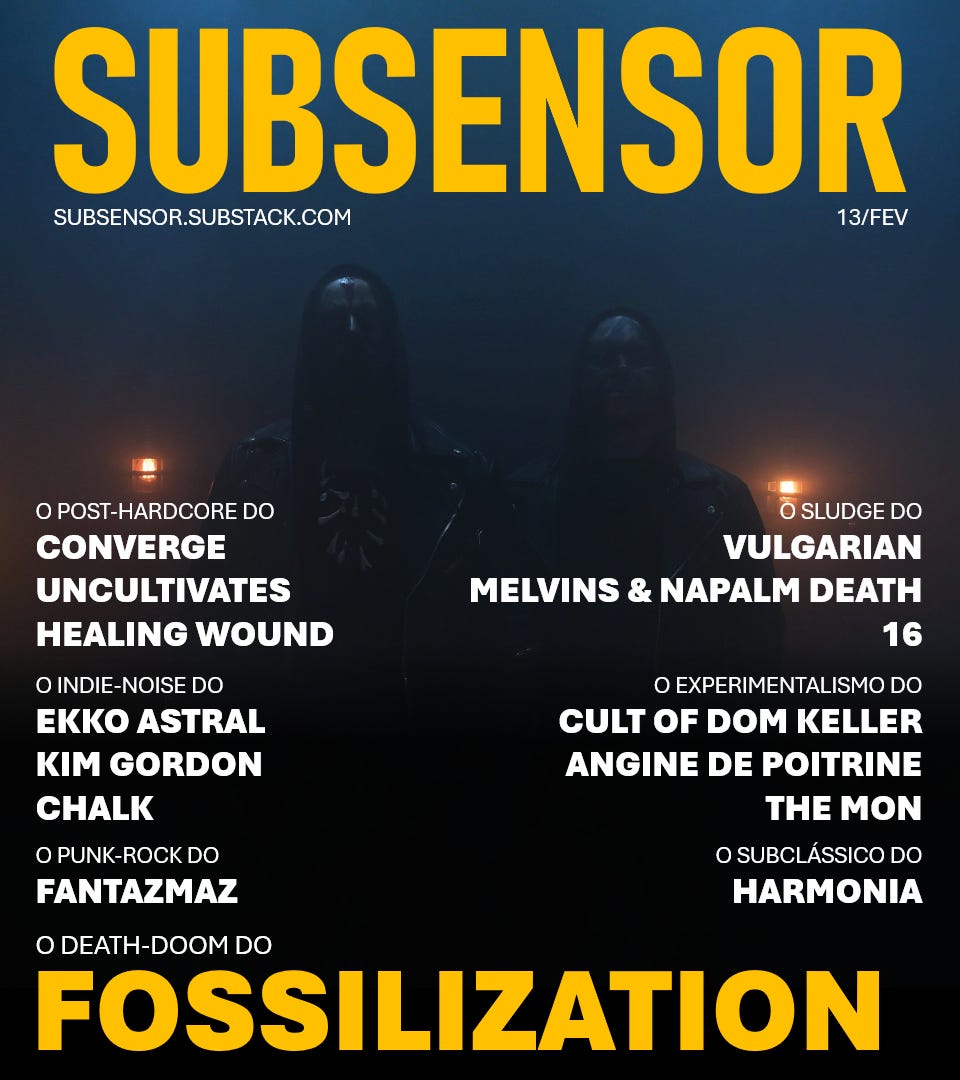 Nessa edição destaco o death-doom do FOSSILIZATION, o post-hardcore do CONVERGE, UNCULTIVATES e HEALING WOUND, o indie-noise do EKKO ASTRAL, KIM GORDON e CHALK, o punk-rock do FANTAZMAZ, o sludge do VULGARIAN, MELVINS & NAPALM DEATH e 16, e o experimentalismo do CULT OF DOM KELLER, ANGINE DE POITRINE e THE MON.